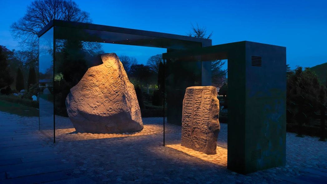 In Kongernes Jelling liegt möglicherweise die Wiege von Dänemark. Denn hier finden sich neben der Geburtsurkunde auch der Taufstein von Dänemark. Das sind die beiden Runensteine aus der Wikingerzeit, die hier unter Glas stehen.